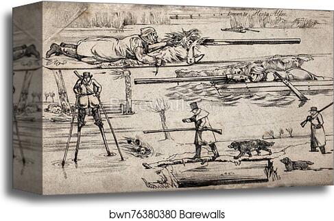 Four different ways of dealing with water during a hunt: a hunter lying on ice, a hunter hiding in a boat, a hunter on stilts and a hunter using a pole as a bridge. by Henry Thomas Alken, Canvas Print